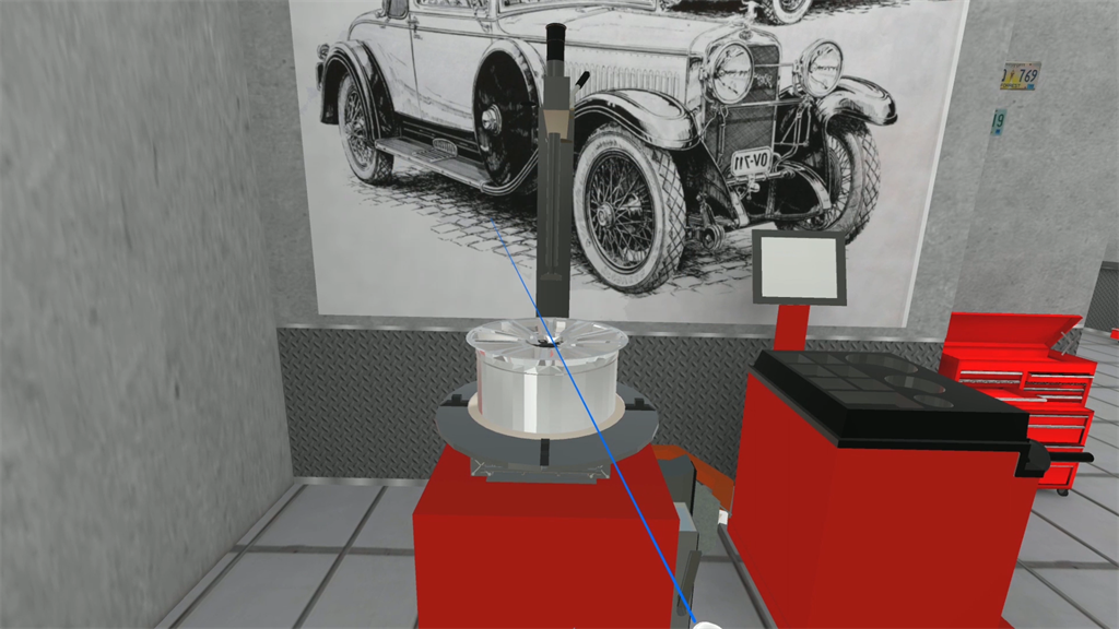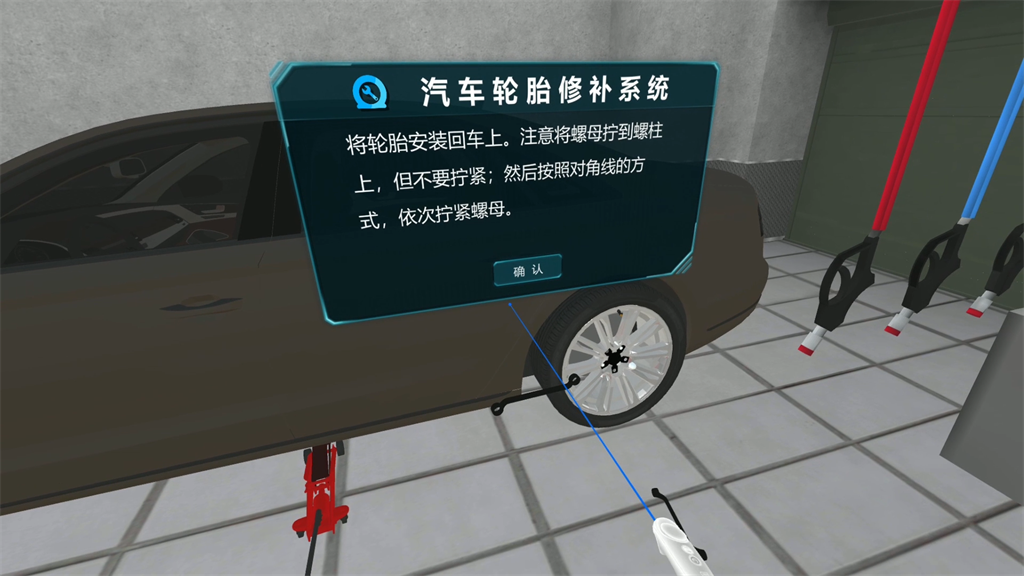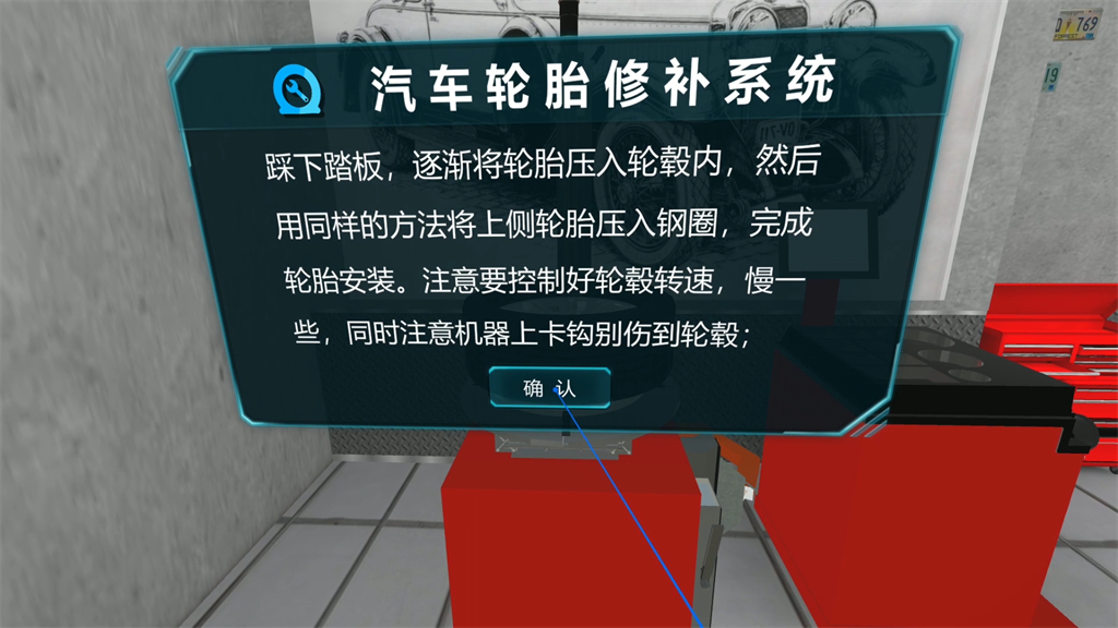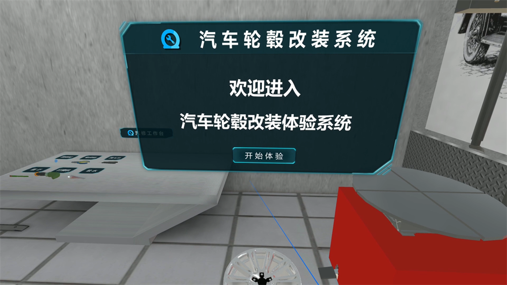 VR汽車輪毅改裝場(chǎng)景,還原汽車車間和換輪毅操作流程,服刑人員帶上VR眼睛,沉浸式學(xué)習(xí)換輪毅拆裝,換輪毅工具的識(shí)別和工具操作,讓服刑人員可以在虛擬場(chǎng)景中反復(fù)實(shí)踐,學(xué)習(xí)汽車輪胎修補(bǔ)技能。
