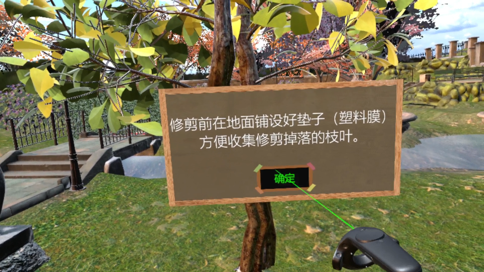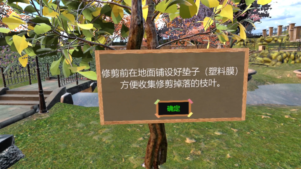VR園藝工培訓(xùn)場(chǎng)景,還原園藝修剪技能實(shí)操,虛擬仿真園林場(chǎng)景,體驗(yàn)者學(xué)習(xí)使用修剪樹(shù)木,園林剪、電鋸等工具,并通過(guò)系統(tǒng)交互,按照語(yǔ)音指示使用電鋸對(duì)樹(shù)墻進(jìn)行修剪,使用高枝鋸對(duì)果樹(shù)進(jìn)行修剪等園藝修剪任務(wù)。