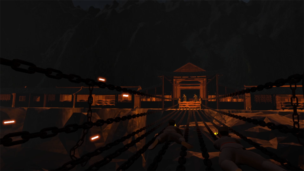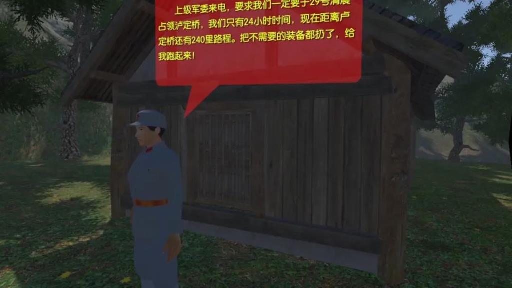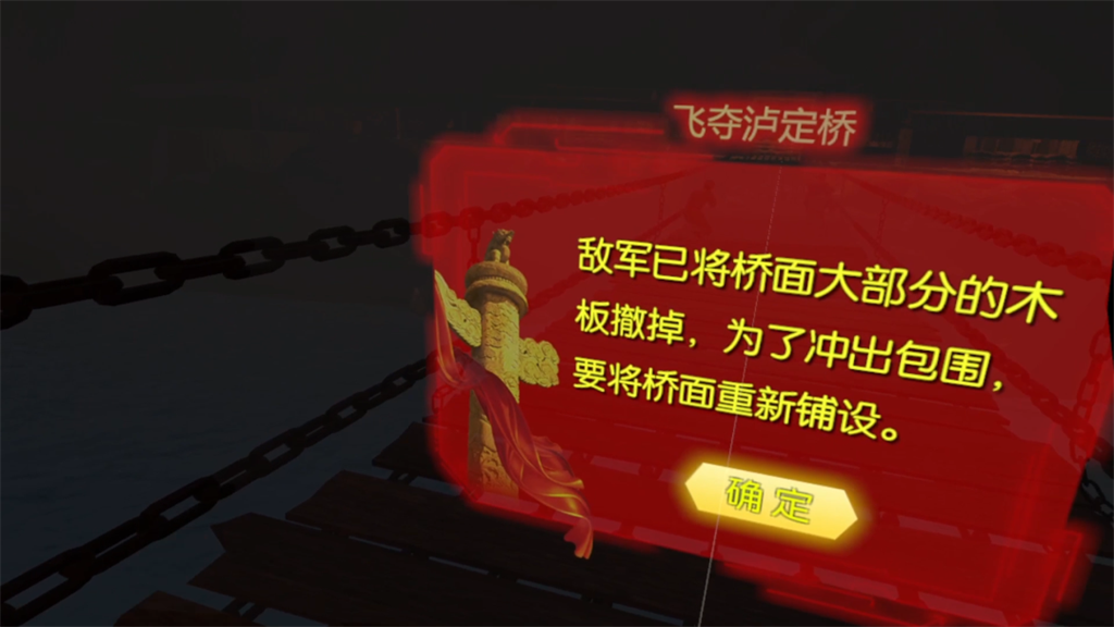 在VR飛奪瀘定橋體驗(yàn)系統(tǒng)2.0中,體驗(yàn)者載上VR眼鏡,穿越到1935年5月29日的那天夜晚,眼前便是瀘定橋,橋面腳下是鎖鏈森森,江水濤濤,稍有不慎就會(huì)遇險(xiǎn)落水。環(huán)顧四周,戰(zhàn)友們?cè)跇屃謴椨曛信η斑M(jìn)。拿起手彈,用力一擲,手榴彈便在敵方陣中應(yīng)聲爆炸,熱血澎湃的你恨不得射光所有的子彈,將敵人全部消滅,但是夜色昏暗,橋面不穩(wěn),沒(méi)有遮擋,你和戰(zhàn)友們只能抓緊鎖鏈,躲避子彈,緩慢前進(jìn)。