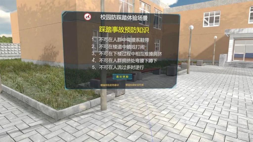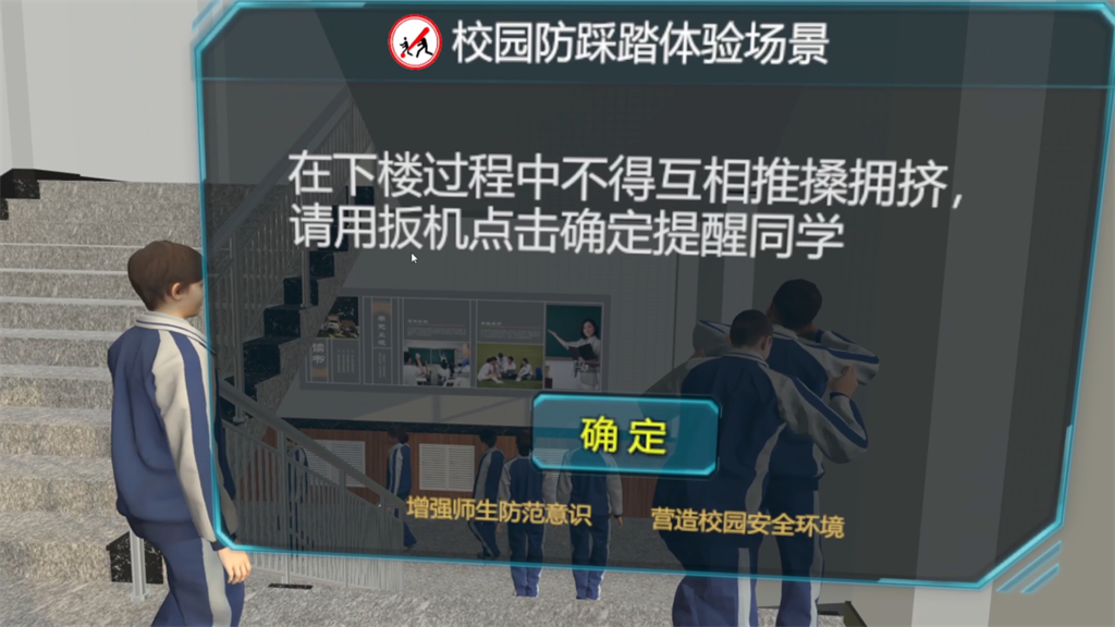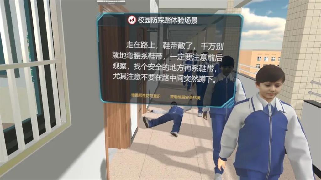 校園VR防踩踏體驗(yàn)場(chǎng)景軟件從學(xué)校日常的早操入手,更具真實(shí)感與代入感;在校園早操準(zhǔn)備過(guò)程中,學(xué)生們需集體前往操場(chǎng),期間有同學(xué)在彎腰系帶、樓道走廊內(nèi)亂竄打鬧、人群擁擠處彎腰下蹲撿東西、在人流處逆向跑步、在下樓樓梯時(shí)互相推操擁擠、在下樓樓梯發(fā)生意外跌倒后,后面未知的人群依然涌動(dòng)前行的狀況。