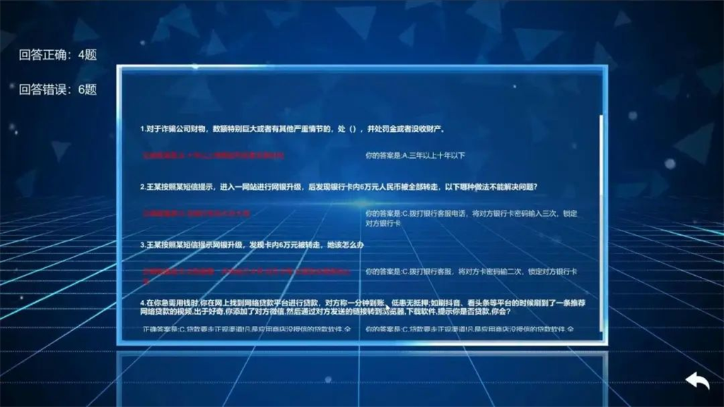 題目涵蓋當(dāng)前流行的詐騙方式,例如刷單詐騙、冒充微信、投資理財(cái),通過(guò)簡(jiǎn)單的互動(dòng)答題提高預(yù)防意識(shí)。整個(gè)體驗(yàn)流程以互動(dòng)答題的形式展開,玩家需要從多個(gè)選項(xiàng)中選擇正確選項(xiàng),體驗(yàn)完系統(tǒng)會(huì)給出評(píng)分和實(shí)時(shí)反饋,幫助用戶識(shí)別詐騙套路。用戶不僅可以通過(guò)答題學(xué)習(xí)詳細(xì)的詐騙知識(shí),還能在互動(dòng)中掌握全面的防范措施和安全建議,例如如何保護(hù)個(gè)人信息、避免上當(dāng)受騙等。